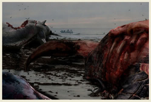 The monster is a 240-300 foot high[7] quadruped with long tri-fork finned tail. The uppermost double-jointed limb pair is longer than the other two, ending in a multi-fingered hand which can bend backward so that the creature can walk on its fingers. The double-jointed, squat legs are powerful enough to support the creature’s mass, and yet still allow it to move relatively quickly for an organism of its size. Each of its feet is 30-40 feet in length, roughly the size of a city transit bus.[7] The creature is covered in gray skin that exhibits a white pallor, possibly due to an absence of light on the ocean floor. The skin is also host to thousands of dog-sized parasites creatures.